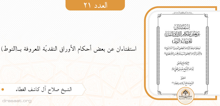 استفتاءان عن بعض أحكام الأوراق النقديّة المعروفة بـ(النوط) أحدهما موجّه للميرزا النائينيّ والآخر للسيّد أبو الحسن الأصفهانيّ (قدّس سرّهما) مع توضيح وتعليق الشيخ حسين الحلّيّ (قدّس سرّه)